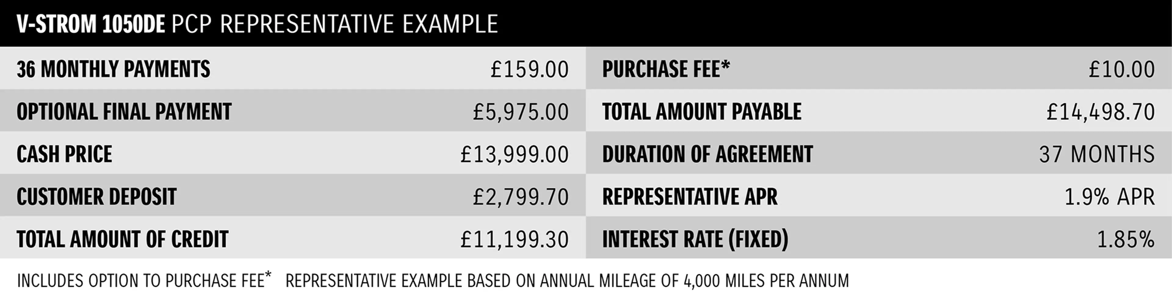 PCP Finance offer applies to the purchase of a new V-Strom 1050DE only from a participating Suzuki Dealership. The motorcycle must be purchased and registered between 12/01/2026 and 31/03/2026 to qualify for the offer. £500 minimum deposit required. Credit subject to status, UK residents aged 18+. Suzuki Financial Services Ltd, St.William House, Tresillian Terrace, Cardiff, CF10 5BH. Finance figures applicable at time of print and are subject to change. Representative Example is based upon an annual mileage of 4,000 miles per annum. With PCP, once you have paid all of the regular monthly repayments you have the option to: 1. Return the motorcycle and not pay the Optional Final Repayment. In this example if the vehicle has exceeded 12,333 miles, a charge per excess mile will apply of 6p plus VAT will apply per excess mile. If the motorcycle is in good condition (fair wear and tear accepted) and has not exceeded the maximum agreed mileage, you will have nothing further to pay, 2. Pay the Optional Final Repayment to own the motorcycle, or 3. Part exchange the motorcycle subject to settlement of your existing credit agreement; new credit agreements are subject to status.