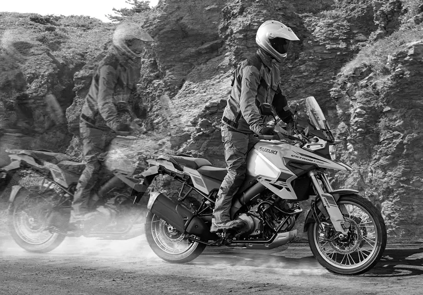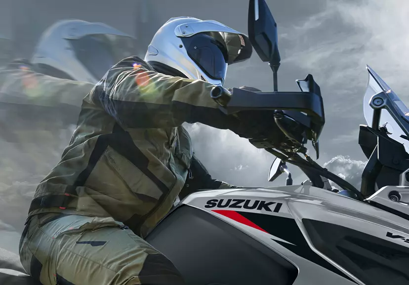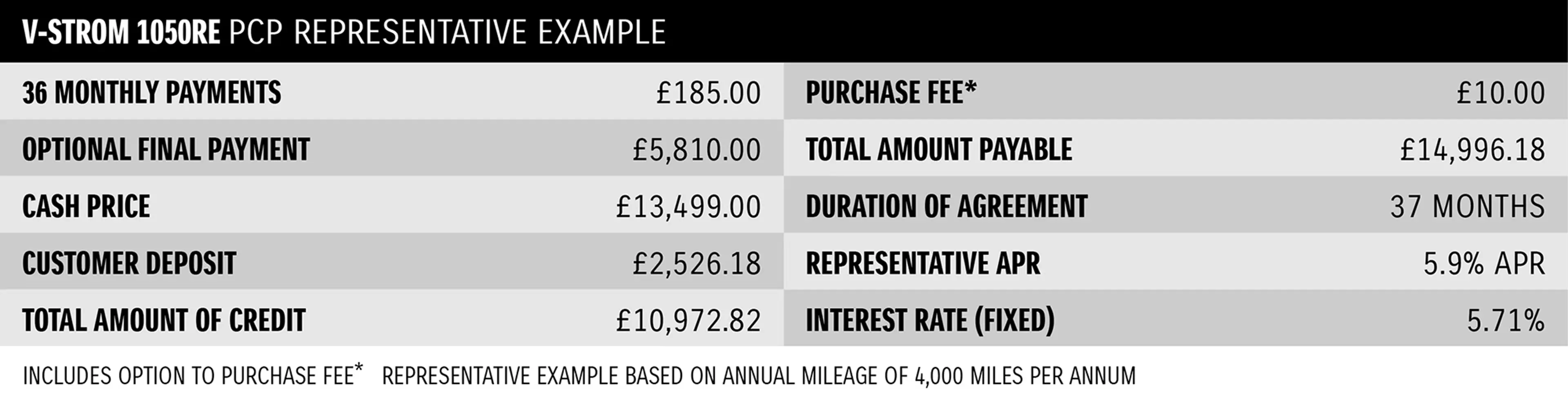 PCP Finance offer applies to the purchase of a new V-Strom 1050RE only from a participating Suzuki Dealership. The motorcycle must be purchased and registered between 01/10/2025 and 31/03/2026 to qualify for the offer. £1,000 minimum deposit required. Credit subject to status, UK residents aged 18+. Suzuki Financial Services Ltd, St.William House, Tresillian Terrace, Cardiff, CF10 5BH. Finance figures applicable at time of print and are subject to change. Representative Example is based upon an annual mileage of 4,000 miles per annum. With PCP, once you have paid all of the regular monthly repayments you have the option to: 1. Return the motorcycle and not pay the Optional Final Repayment. In this example if the vehicle has exceeded 12,333 miles, a charge per excess mile will apply of 6p plus VAT will apply per excess mile. If the motorcycle is in good condition (fair wear and tear accepted) and has not exceeded the maximum agreed mileage, you will have nothing further to pay, 2. Pay the Optional Final Repayment to own the motorcycle, or 3. Part exchange the motorcycle subject to settlement of your existing credit agreement; new credit agreements are subject to status.