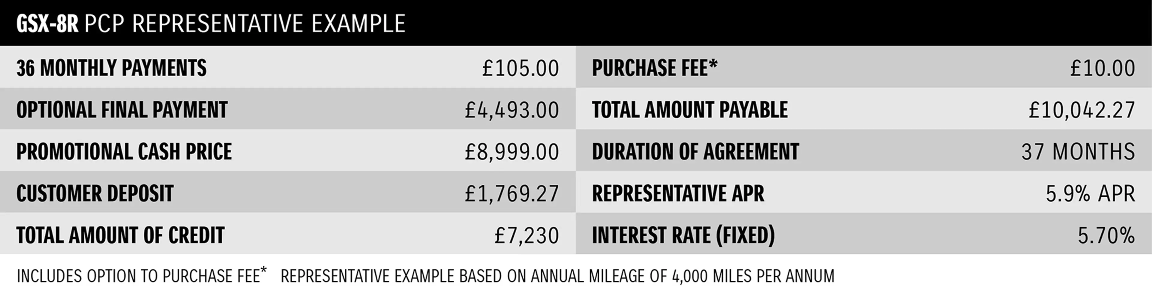 PCP Finance offer applies to the purchase of a new GSX-8R only from a participating Suzuki Dealership. The motorcycle must be purchased and registered between 01/04/2026 and 30/06/2026 to qualify for the offer. £1,000 minimum deposit required. Credit subject to status, UK residents aged 18+. Suzuki Financial Services Ltd, St.William House, Tresillian Terrace, Cardiff, CF10 5BH. Finance figures applicable at time of print and are subject to change. Representative Example is based upon an annual mileage of 4,000 miles per annum. With PCP, once you have paid all of the regular monthly repayments you have the option to: 1. Return the motorcycle and not pay the Optional Final Repayment. In this example if the vehicle has exceeded 12,333 miles, a charge per excess mile will apply of 6p plus VAT will apply per excess mile. If the motorcycle is in good condition (fair wear and tear accepted) and has not exceeded the maximum agreed mileage, you will have nothing further to pay, 2. Pay the Optional Final Repayment to own the motorcycle, or 3. Part exchange the motorcycle subject to settlement of your existing credit agreement; new credit agreements are subject to status.