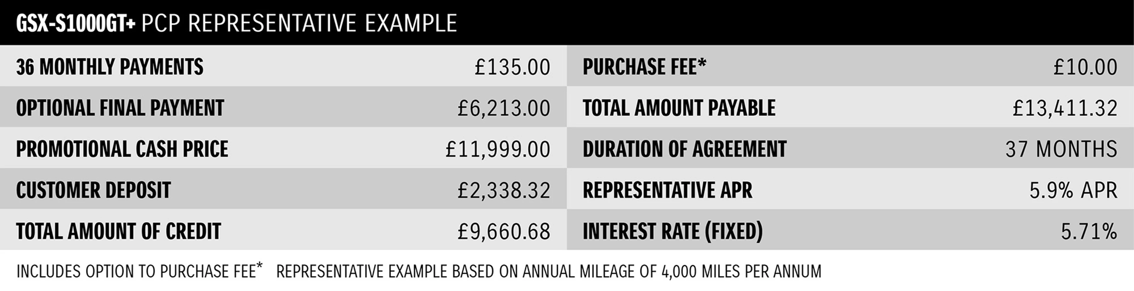 PCP Finance offer applies to the purchase of a new GSX-S1000GT+ only from a participating Suzuki Dealership. The motorcycle must be purchased and registered between 01/10/2025 and 31/03/2026 to qualify for the offer. £1,000 minimum deposit required. Credit subject to status, UK residents aged 18+. Suzuki Financial Services Ltd, St.William House, Tresillian Terrace, Cardiff, CF10 5BH. Finance figures applicable at time of print and are subject to change. Representative Example is based upon an annual mileage of 4,000 miles per annum. With PCP, once you have paid all of the regular monthly repayments you have the option to: 1. Return the motorcycle and not pay the Optional Final Repayment. In this example if the vehicle has exceeded 12,333 miles, a charge per excess mile will apply of 6p plus VAT will apply per excess mile. If the motorcycle is in good condition (fair wear and tear accepted) and has not exceeded the maximum agreed mileage, you will have nothing further to pay, 2. Pay the Optional Final Repayment to own the motorcycle, or 3. Part exchange the motorcycle subject to settlement of your existing credit agreement; new credit agreements are subject to status.