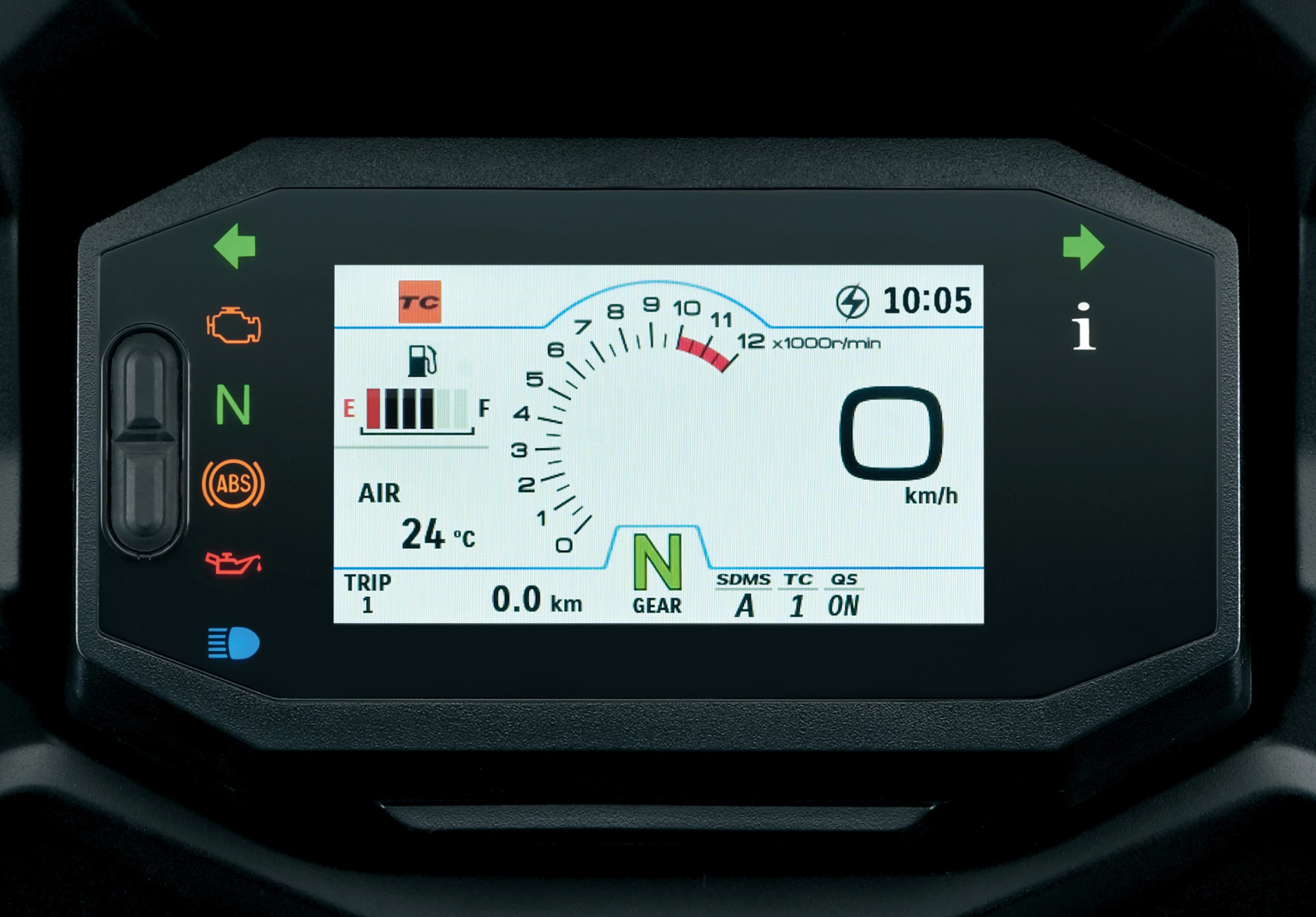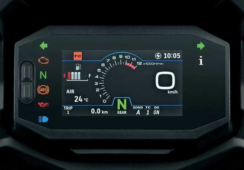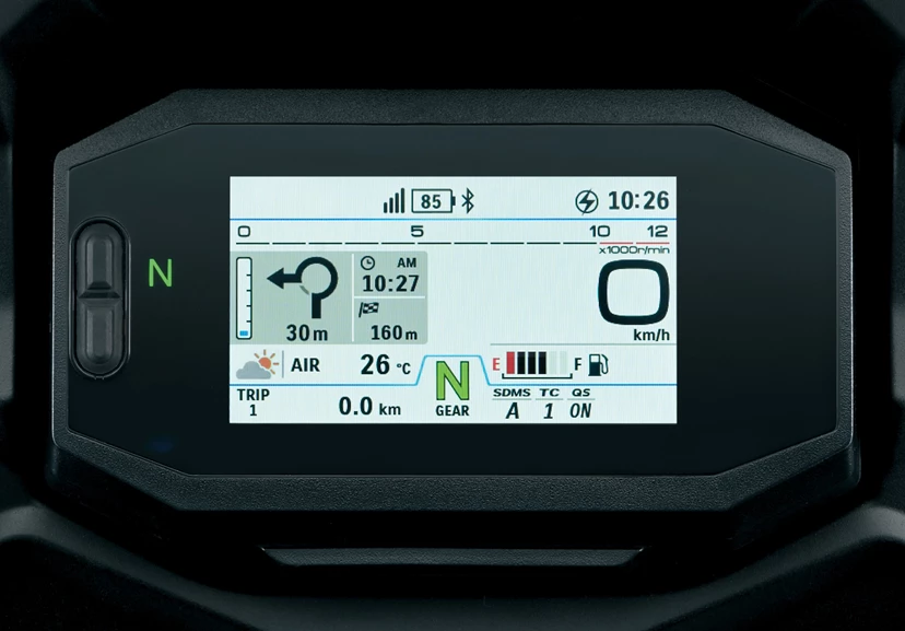 The full-colour TFT instrument panel is designed to display a wide range of information clearly and intuitively. Every element of the layout has been carefully considered to make settings and mode changes effortless. The intuitive design allows riders to operate the system naturally, for a user-friendly interface that enhances the riding experience. Smartphone connectivity enables a turn-by-turn navigation display in an easy-to-read format. When connected, the meter switches to a dedicated horizontal layout; when not connected, it displays a clean, classic circular tachometer. A brightness sensor automatically adjusts the screen illumination to match ambient light, or the rider can select day (white) and night (black) display modes manually.