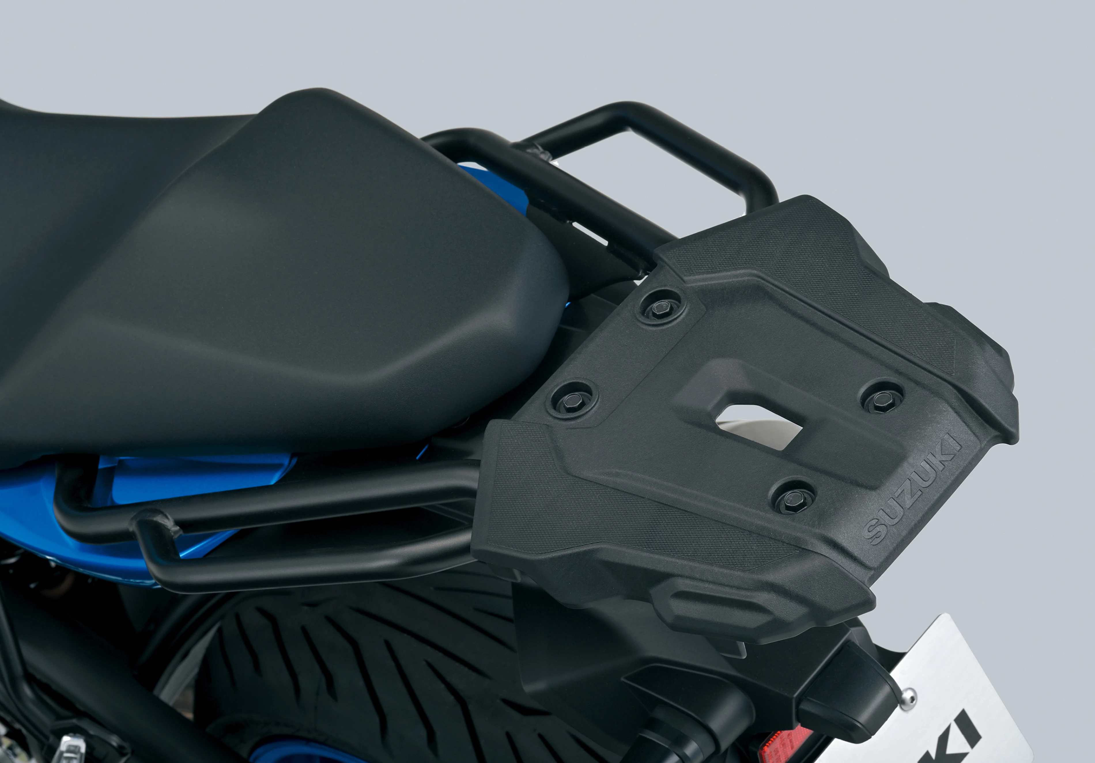 An expansive, standard-equipment moulded plastic rear carrier gives this midweight model extra versatility for both carrying and touring convenience. Its tubular steel rear rack was designed to be a visual extension of the SV-7GX’s open trellis-style frame. It is also features optimised welding and tube construction. Large, ergonomic grab rails have also been integrated into its design for enhanced passenger security and comfort. With numerous moulded-in carrier hooks to ease tie-down convenience, the carrier has also been structurally reinforced to maintain stability at full load capacity, even with its optional 45L top case attached.