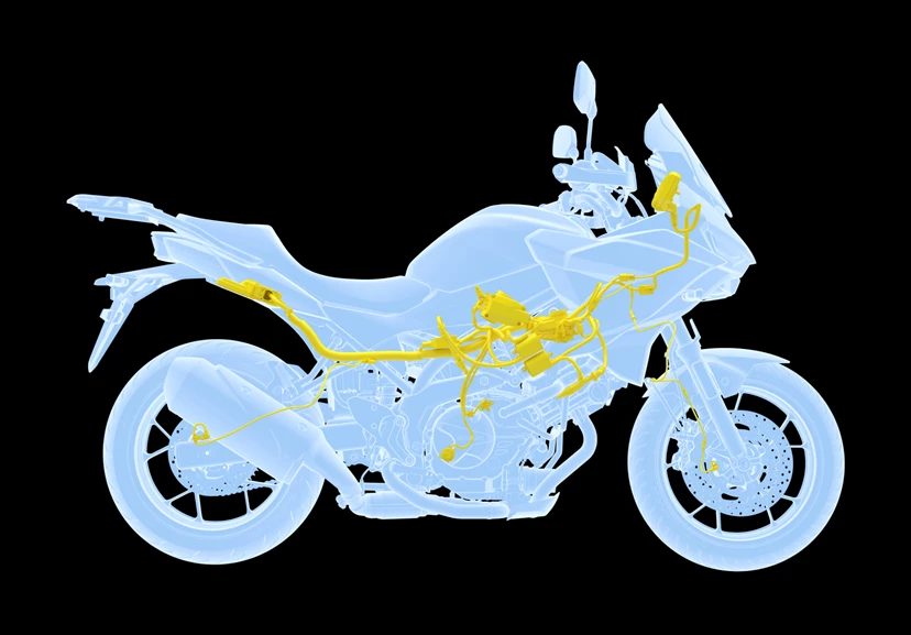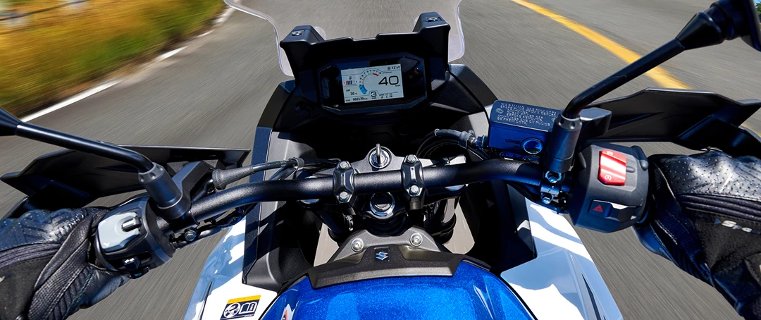The SV-7GX’s wide, 740mm handlebars have been positioned close to the rider, while also featuring a wide width for increased leverage and better feel, promoting a commanding field of vision and a relaxed, upright posture. With integrated bar weights to help mitigate vibration and fatigue over long rides, development engineers also focused on testing multiple grip angles and sweep profiles to achieve a more tapered, natural hand position that suits a wide variety of body types.
