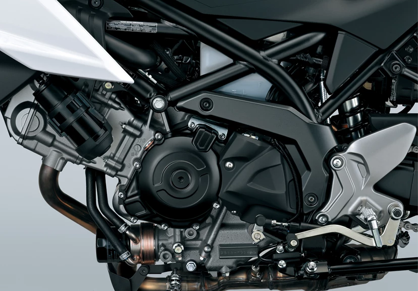 Suzuki’s legendary liquid-cooled 645cc, DOHC, 4-valve, 90-degree, V-twin engine, a powerplant with over 25 years of proven performance and global acclaim. This engine has earned a reputation for its slim, compact design, linear torque, and exceptional reliability. For the SV-7GX, it has been refined to meet the demands of modern crossover versatility while preserving its distinctive, character-rich power pulses.